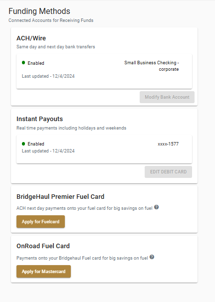 There are 4 payment types. ACH, Instant Payout, BridgeHaul Premier Fuel Card, and On Road Fuel Card.