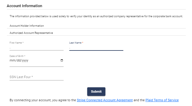 Fill in the required fields and click Submit. This will then redirect you to PLAID to connect your desired account.