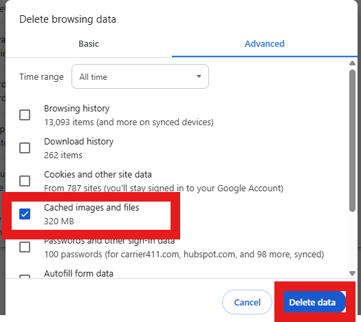 3. A new window will pop up. Uncheck/Check the boxes so that only the “Cached images and files” box is checked. Set the Time range to All time. Click the "Clear Data" button.